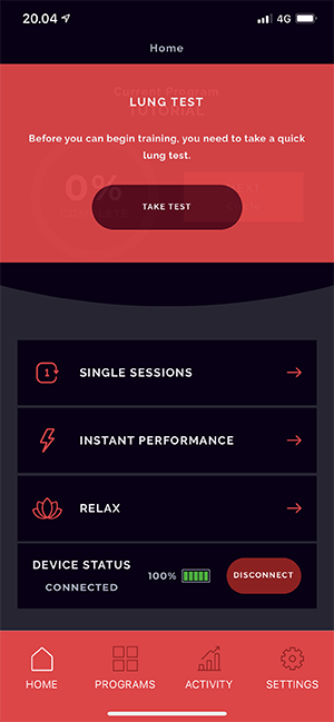 Før man kan starte med træningen, skal man tage en lungetest. Altså en helt kort test af indånding og udånding. Jeg vælger for en sikkerheds skyld lige at se demonstrationsvideoen først. Aha. En kendt mandlig CrossFit atlet, der ser meget målrettet ud, viser vej, mens en behagelig engelsk stemme forklarer.